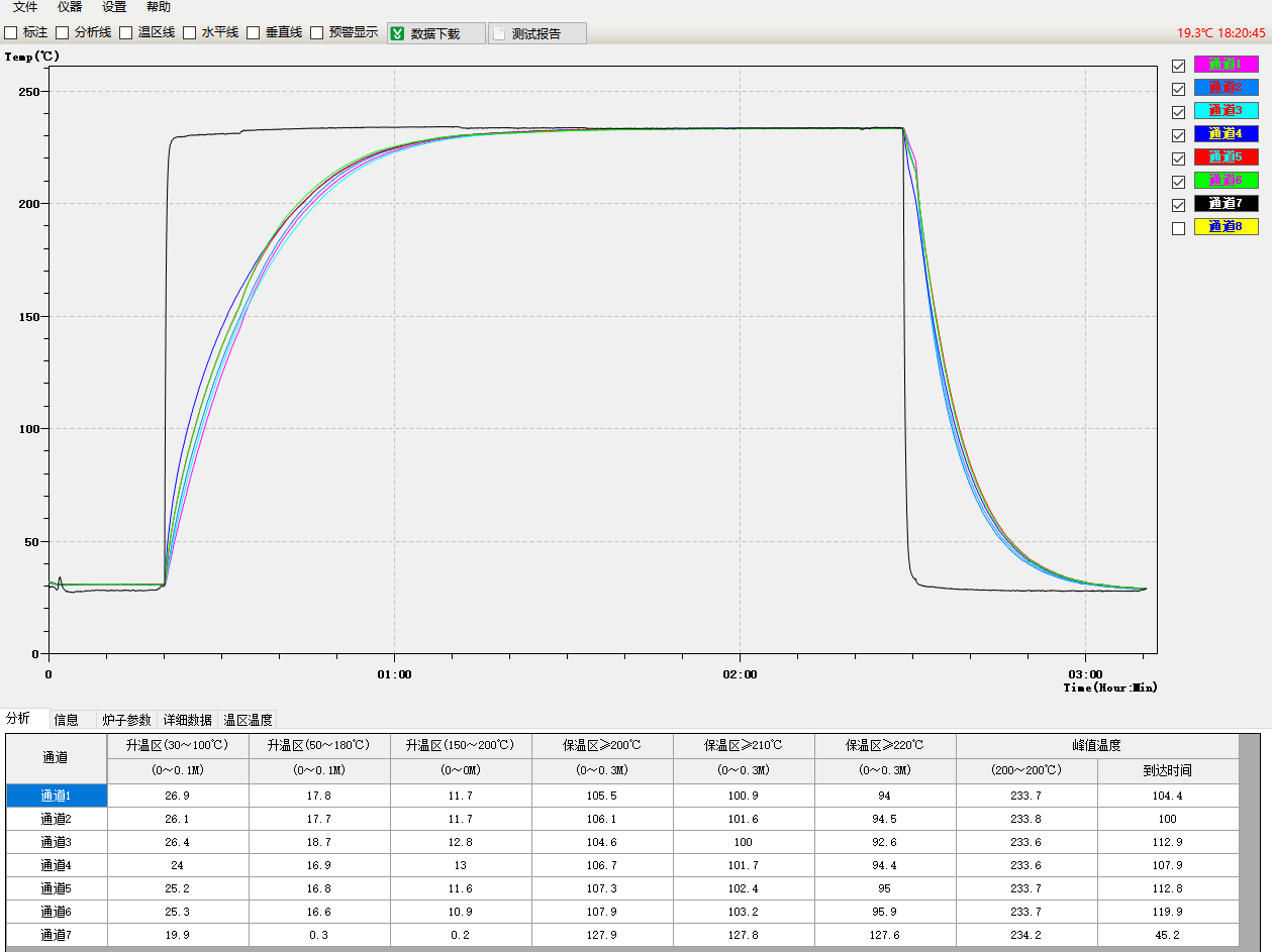 9、軟件具有智能預警功能,測試出來曲線瞬間判斷出來爐溫是否合格。 |
